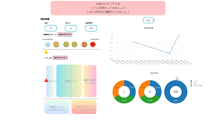 PCのWebカメラ映像を20秒間撮影し、AIシステムを用いて「まばたきの回数」「脈波のゆらぎ」「筋肉のこわばり」等の生体データを取得・解析します。これによりストレス状態(自律神経バランス)が可視化できるかどうかを技術実証します。