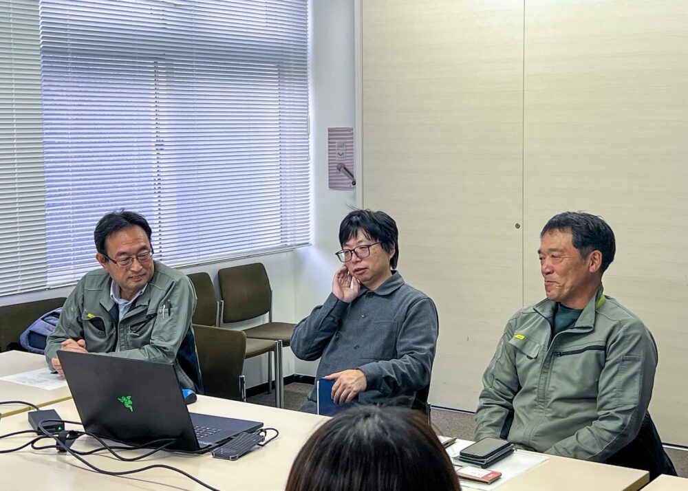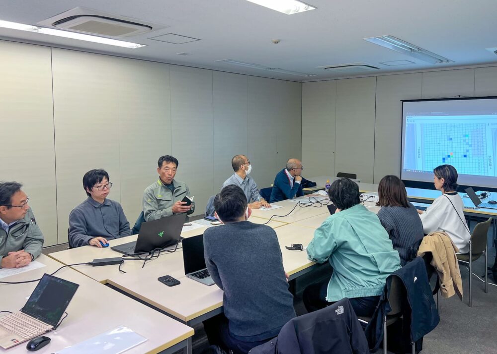 次のステップとして、開発したシステムを実際の現場でどのように活用するか、そのイメージを具体化する必要があります。そのための意見交換会が実施され、プロジェクトメンバーの他、公園の芝生管理を担う岩間造園株式会社が参加しました。