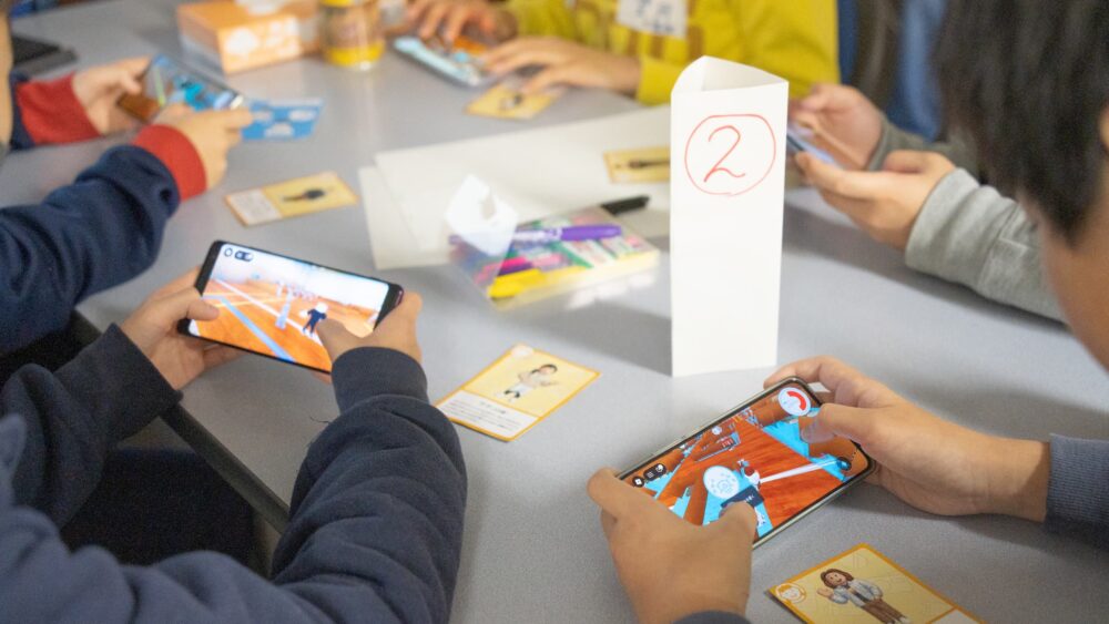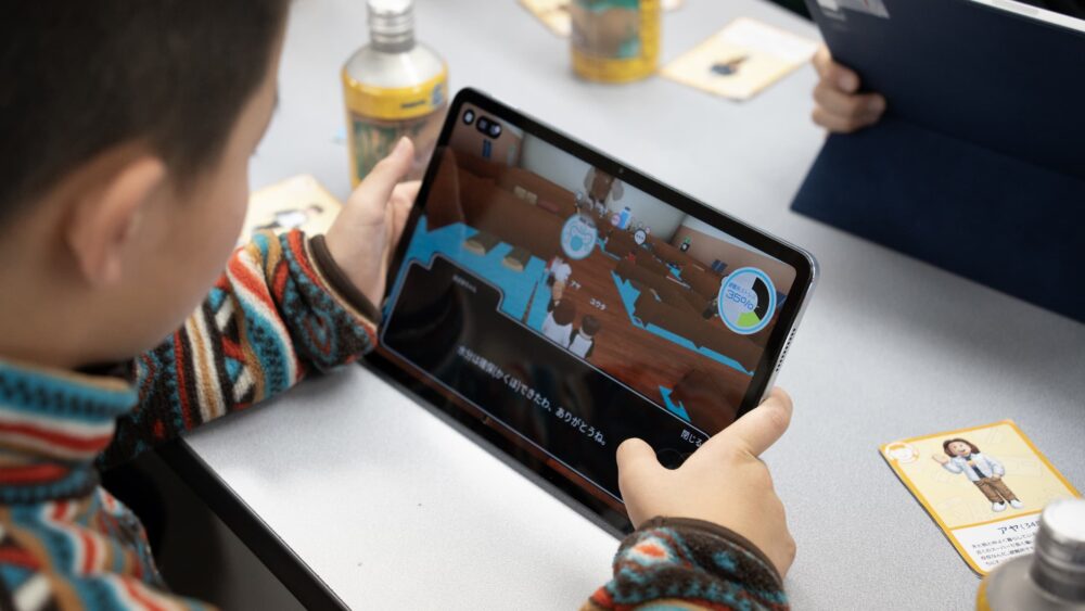 体験会はまず、名古屋市が制作した防災啓発動画を全員で視聴し、防災の必要性を学ぶことからスタート。その後、一人ずつ端末(スマートフォンやタブレット)を手に取り、グループに分かれてゲームの舞台となる「災害発生後の避難所(体育館)」のメタバース空間へ入りました。最初は操作に戸惑う様子も見られましたが、子どもたちはすぐに操作に慣れ、メタバース空間の探索を楽しみ始めました。