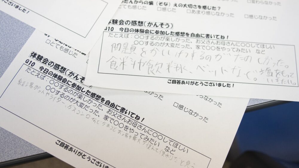 体験会終了後のインタビューやアンケートでは、参加した子どもたちから「ゲームで避難所について学べるのがとても面白かったです」「避難所で避難をしたことがなかったので、今回の体験をして、普段からもっと備えようと思いました」といった熱量の高い声が多く寄せられました。「避難所ではみんなで助け合うことが大切だと思いましたか?」という設問に対しては、94%の子どもたちが「とても感じた」「感じた」と回答しました。一方、次のように「ゲームの楽しさ」のみに焦点を当てた意見も多く集まりました。