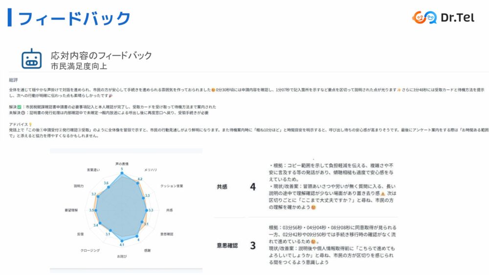 本プロジェクトの中核となる「Dr.Tel」は、従来可視化が難しかった「コミュニケーションの質」をデータとして可視化する応対品質評価AIツールです。 元々はコールセンター等の電話対応を解析するために開発されたシステムですが、その高度な解析能力を行政窓口へと応用しました。
