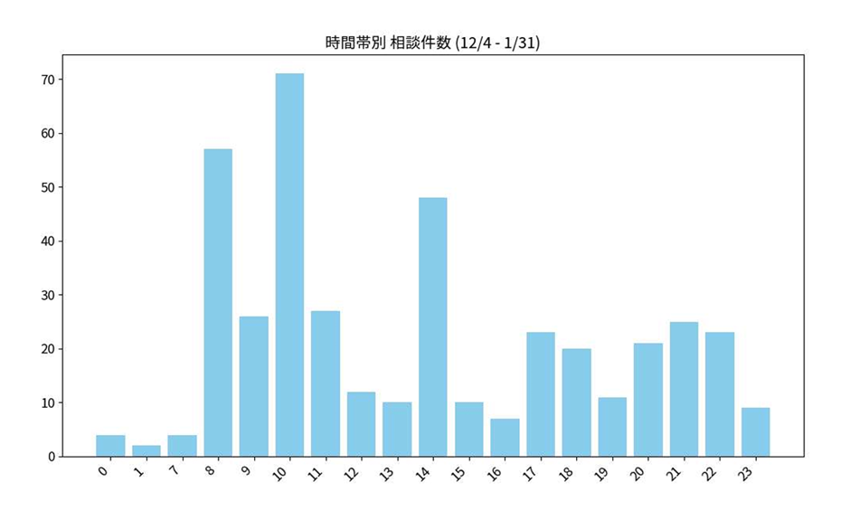 平日の夜間(17時以降)や土日など、これまでスクールカウンセラーに相談できなかった時間帯での利用が少なからず見られました。また、利用者の約7割が「これまで誰にも相談したことがない(今回が初めて)」と回答しており、潜在的な悩みの掘り起こしに寄与しています。実証実験期間中に、AIでの相談をきっかけとして実際に大人への相談・連携(コーディネーション)に至ったケースが4件ありました。