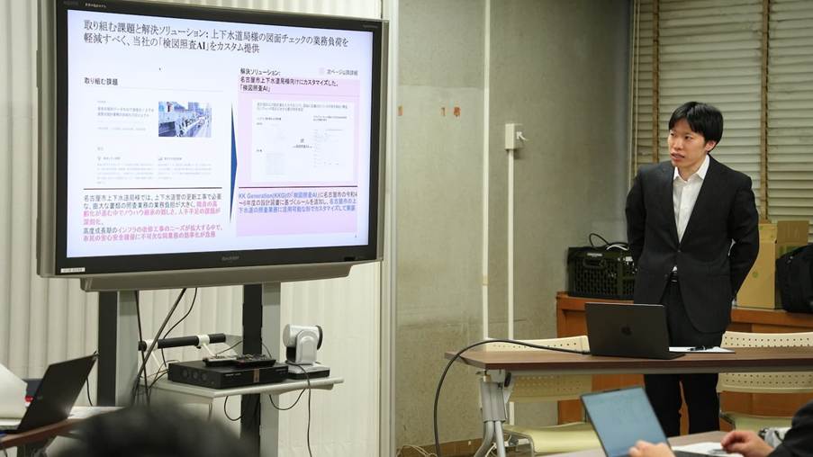 当日はメディア関係者にお集まりいただき、まずは上下水道局の担当者から本市のインフラが抱える課題背景を説明しました。続いて、KKGの担当者から技術的なアプローチを解説し、実際の設計データを用いてシステムを動かすデモンストレーションを行いました。デモの後には、今回導入したAIの技術的な特徴や今後の展開などについて活発な質疑が行われ、本取り組みへの関心の高さが感じられました。