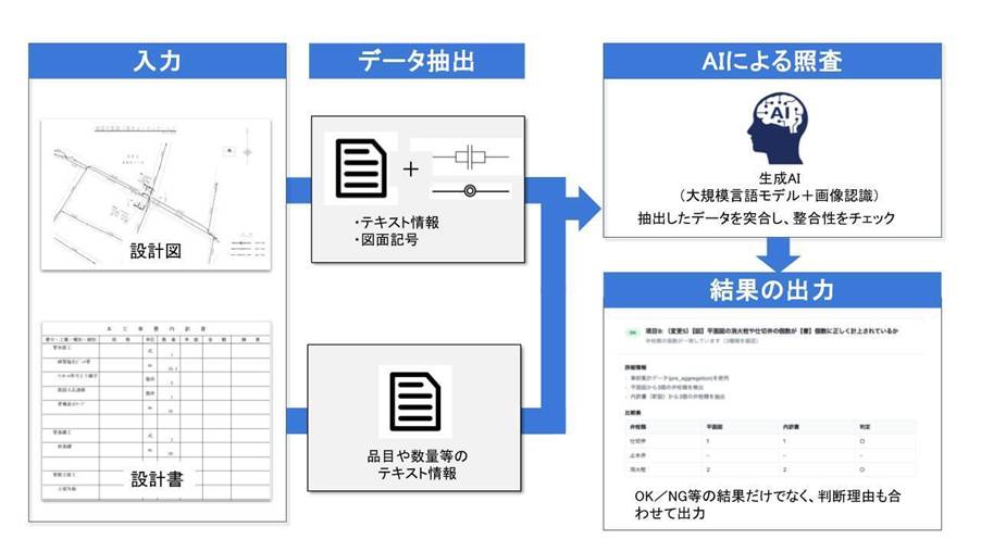 今回、下水道の小規模な工事を対象に、管の口径や延長など基本的な9項目について検証を行いました。その結果、ある1件のテストケースにおいて、熟練職員が目視で約350秒要していた照合作業を、開発したAIモデルは約35秒で完了させました。これは全体の平均速度ではなく、あくまで特定条件下での成果ですが、デジタル化された電子ファイルにおける「単純な突き合わせ作業」において、AIの高い処理能力を確認することができました。